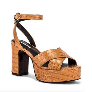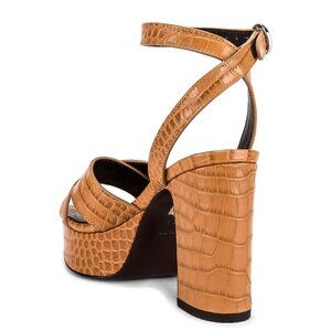 Snakeskin embossed leather upper with leather sole. Ankle strap with buckle closure. Platform measures approx 1" H.Heel measures approx 3.5" H.