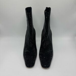 Boots, ankle boots, high heels, heeled boots, women's boots, Sparkly, glitter, embellished, rhinestone, crystal, sequin, black, shiny, textured, stiletto heel, zipper closure, Glamorous, formal event, parties, night out, trendy, edgy.