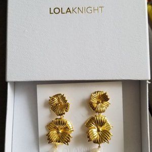 Description from lolaknight.com: These modern earrings were inspired by the African Violet and feature freshwater pearls. The Maelle earrings are handcrafted from brass and finished in 18ct gold plating.They are a statement earring and are perfect for taking you from day to night. We use 925 sterling silver earring posts for pierced ears to prevent irritation.