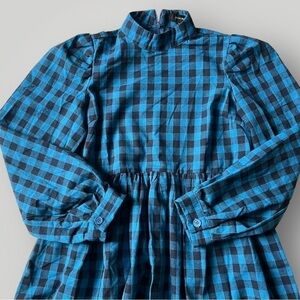 Adorable Lola May blue + black gingham smock dress with oversized, flowy fit. Features a high neckline, pleated balloon sleeves with button cuffs, and hidden side pockets. Easy pull-on style with effortless volume.