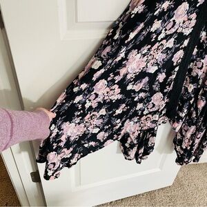 Black maxi shift dress with beige, pink, and violet purple floral print.