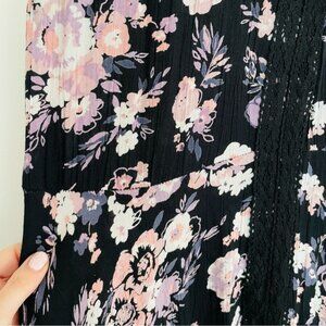Black maxi shift dress with beige, pink, and violet purple floral print.
