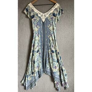 Lola P. Midi Handkercheif Hem Dress Large Boho Floral Lace Artsy Beach Blue