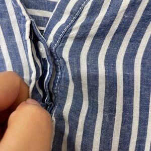 Effortlessly breezy and stylish, this Lola River linen blend top is perfect for warm-weather days or layering year-round. Featuring a flowy relaxed fit, blue and white vertical stripes for a flattering silhouette, a split neckline with partial button front, and rolled short sleeves for a casual-chic vibe. High-low hem adds a modern touch, ideal for pairing with denim shorts, linen pants, or white jeans