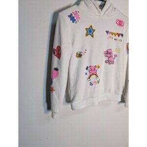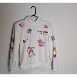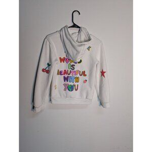Lola and The Boys big girls size 10. white hoodie with vibrant graphics featuring animals, stars, rainbows, and inspiring "The World Is Beautiful With You" phrase. Offers always warmly received.