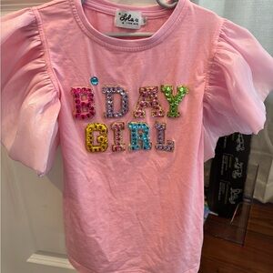 Pink top with sequin 'Bday Girl' design. Ruffled sleeves. Fun and festive. There is some small paint spots on sleeve (as pictured) which are not noticeable from the front given the ruffled nature of the sleeve. Size 10, super fun for a birthday celebration!
