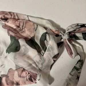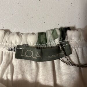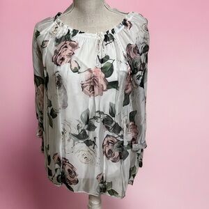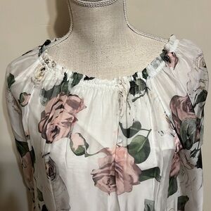 Lola peasant style blouse. Scoop neck with stretch and tassel tie. Sheer pink floral bodice which is lined in white. 3/4 Gathered sleeve is not lined , cuffs. Have a slit and bow tie . This is a beautiful feminine blouse from Italian manufacture. New with tag. Size large