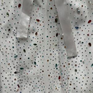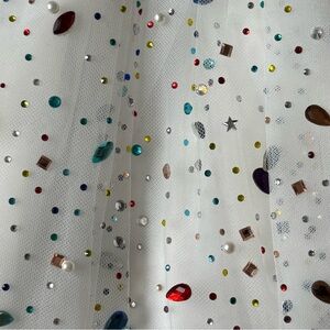 • This stunning dress is adorned with an array of vibrant crystal gems, scattered across the flowing fabric to create a mesmerizing rainbow effect.