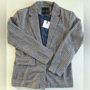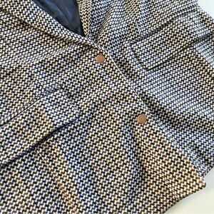 Lola Jeans Monaco Blazer. Classy but comfy blazer for work or formal occasions. Built-in shoulder pads. Great for the office! Super rad weave and tweed effect print. Gender neutral. Measurements in photos.