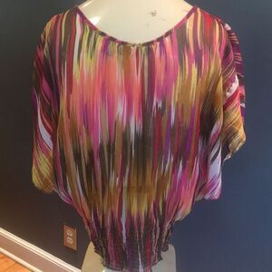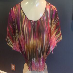 Lola P. bright multicolor print semi-sheer top. Draped sleeveless armholes that are open all the way to wide elasticized waistband. Gathered neckline. Scattered small sequins in front. 100% polyester. Size large. Excellent condition. Nonsmoking home.