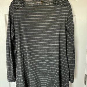 Great striped tunic top from Lole with a twist overlay that would be great for pre/during/post workout or casual wear thanks to it's sweat-wicking fabric. It has a scoop neck and long sleeves. Pit to pit is 18" but the material is stretchy. From the back of the neck to the hem is 31.5" so great paired with leggings.