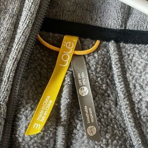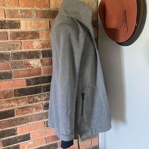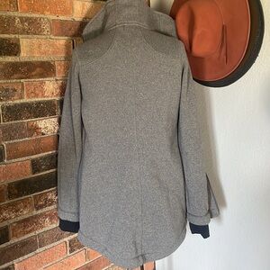 Stylish gray jacket by Lole. Features a full zip front. Cozy and versatile design. Thumb holes with longer black covering at wrist