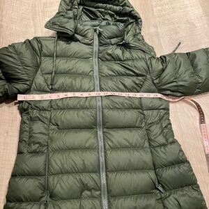 Women's 100% real down jacket, size medium, in a versatile olive green color. This is the Le Claudia puffer jacket style from Canadian outerwear brand Lole in the color "moss". This lightweight, packable jacket features a two way zipper, outer slash pockets for your hands, inner pockets for your cell phone, and a removable, adjustable hood with a drawcord and snaps. This longer jacket covers the hips and features a gently curved hem in the back so that your bottom stays fully covered. Gently worn for one season only, in excellent condition. Normally retails for $200.