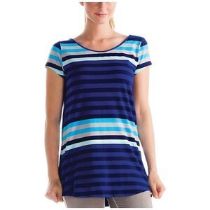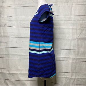 Lola patricia stripe tunic in shades of blue. navy, cobalt, aqua, and bright blue with grey.