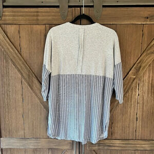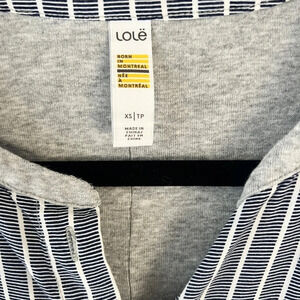 Lole born in Montreal. This oversized 3/4 length sleeve stripped shirt has grey details on the collar and the back.