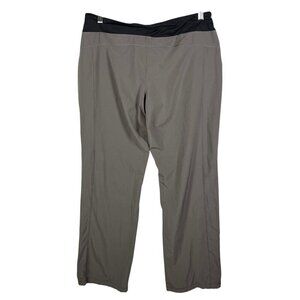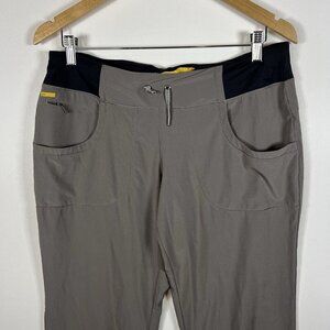 The Lole women's size Medium gray and black activewear drawstring pants are made from a blend of polyester and spandex, offering comfort and stretch. These hiking pants feature a drawstring closure and a straight leg style with a 31-inch inseam. The sustainable design aligns with an eco-friendly and active lifestyle, making them perfect for outdoor activities or workouts. With practical pockets, breathable fabric, and a regular fit, these pants are versatile for year-round wear in various seasons.