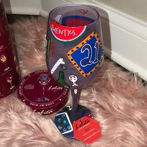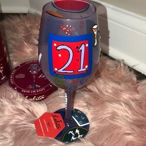 15 oz hand painted wine glass with drink recipe on the bottom. Got this as a birthday gift and never used it. Still in the packaging and super adorable! From the love my wine collection. These make the perfect gift! Box has all it's packaging to keep it in place safely. Rhinestone accents and super cute bright detailing all over. Glass is like a dusty blue color. "21"