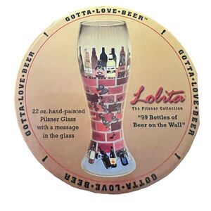 Lolita Hand-painted collectible GOTTA - LOVE - BEER Pilsner Glass; 99 Bottles of Beer on the Wall. There’s a Lolita glass for the beer connoisseur in your life. These gracefully shaped glasses feel solid in the hand with when you get to the bottom of the glass; a humorous saying is waiting. 22oz. Approx 9”h and 3”w at the rim.
