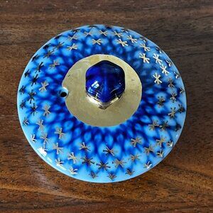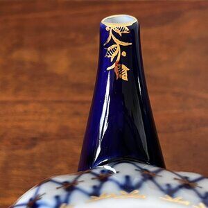 Gorgeous, vintage Lomonosov Imperial Porcelain Cobalt Net mini teapot with lid made in Russia, I believe in or around the 1990s. This small, very glossy porcelain teapot is blue and white with metallic gold detailing. It features an all-over net pattern as well as a floral motif on the spout and handle.