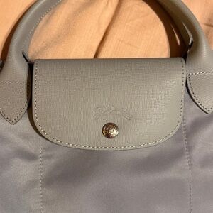 Stylish gray tote bag with an adjustable strap. Features a front pocket and secure closure with a strap and added back strap to secure to your luggage handle. Great condition!