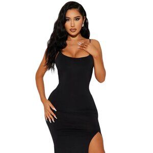 Enhance your wardrobe with our London Cami Midi Dress, featuring adjustable spaghetti straps for a customizable fit. The sleek black design is elevated by a high front slit on the side, adding a touch of sophistication to your look. Made from a stretchy blend of 94% polyester and 6% spandex, this dress ensures both comfort and style for any occasion.