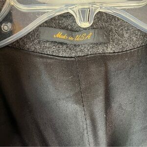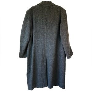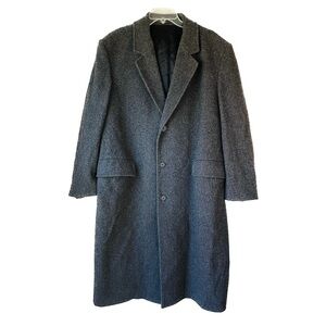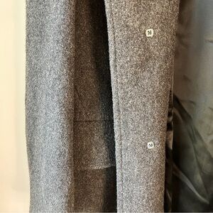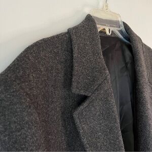 London Fog made in USA 100% wool dark grey overcoat with black buttons. This is a quality, fully-lined men’s top coat wool trench coat in size 44R. Classic trench coat style with flap pockets that are lined in fleece to keep hands warm. Inside lapel pocket.