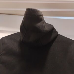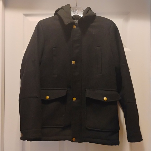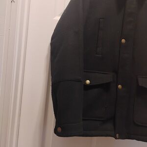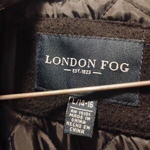 In excellent condition! A classic black hooded jacket by London Fog featuring gold button accents and a zip closure. The jacket is designed for warmth and style, suitable for various occasions.