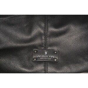 Chic and functional London Fog Collection black faux leather shoulder bag with soft pebbled texture and polished silver-tone logo plaque. The spacious interior and long shoulder strap make this bag perfect for daily use, travel, or work.