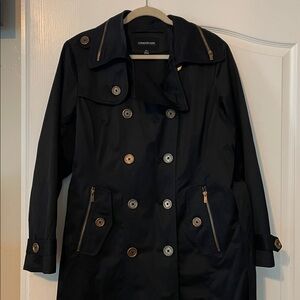 Elegant black trench coat. Double-breasted design. Features button and zipper details. Perfect for stylish layering.