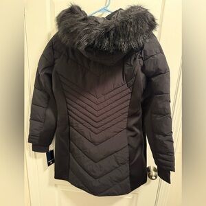 Chic black puffer coat by London Fog. Features a stylish fur-trimmed hood. Perfect for cold weather.