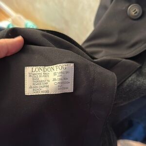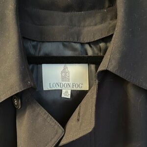 Timeless black trench coat by London Fog. Perfect for any occasion. Sleek and stylish design.
