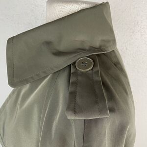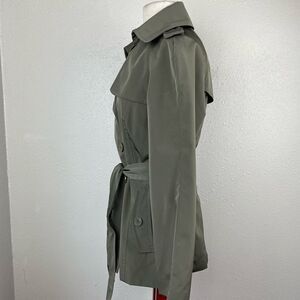Stylish light weight jacket featuring a double breasted button up style and belt at the waist. It measures 20 inches armpit to armpit laying flat, 17 inches at the waist, and 29 inches in length from shoulder to hem. It’s in like new preowned condition.