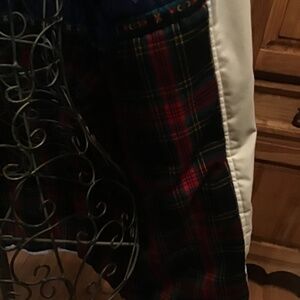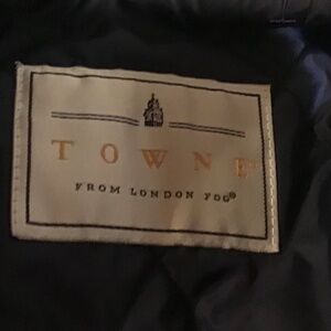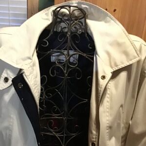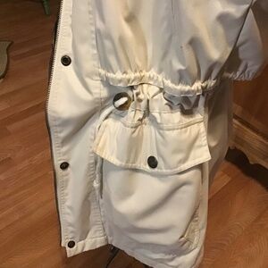 Off white lined utility jacket. Sleeves are cuffed for cold weather, the lining is flannel. The drawstrings have cute button holders, and the collar buckles around the neck if needed. This is a cute jacket, accented with navy blue. I tend to be drawn to the casual, draw string type parkas. Large pockets, warm, attractive, and machine washable. Made by London Fog.