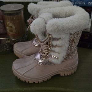 London Fog Girl's Size 13 Snow boots featuring sparkles and faux white fur. In nice used condition!