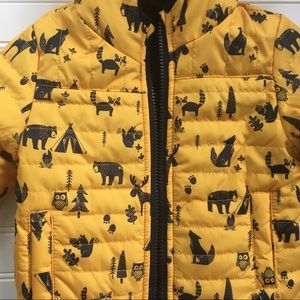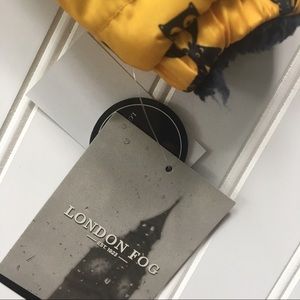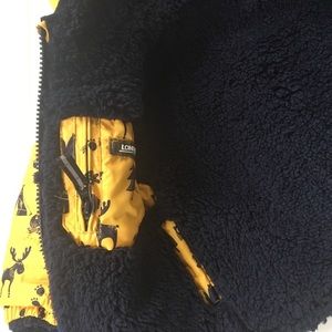 London Fog reversible coat SIZE 12m, one side is yellow with blue print quilted fabric, reverse is navy faux fur, hooded, elastic at sleeve. JUST ADORABLE π
