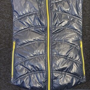 Stay warm and comfortable in this London Fog hybrid softshell puffer jacket in womens size small. Features a quilted insulated front panel, soft knit sleeves and back, full zip closure, yellow zip accents, and two zip pockets. Perfect for fall and winter wear, casual outings, travel, or outdoor activities. Made of polyester with lightweight insulation. Navy color.