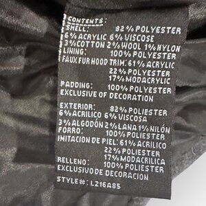 Shell: 2% Polyester 15% Acrylic 6% Viscose 13% Cotton 2% Wool 1% Hylon Lining: 100% Polyester Faux Fur Hood Trim: 61% Acrylic 22 * Polyester 17% Modacrylic Padding: 100% Polyester