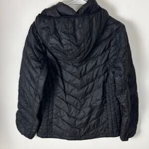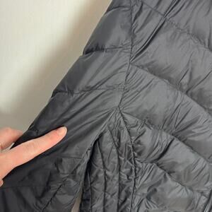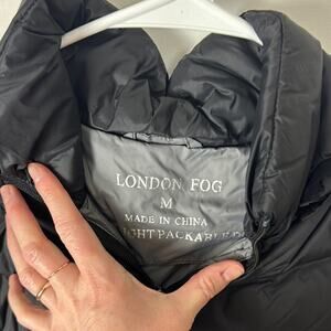 Used London Fog Full Zip Lightweight Packable Down Jacket. This is a women's medium. Listed as used because it appears there is a spot on the interior that has been patched. It is otherwise in gently used condition. Comes with the carrying bag for it. Black throughout. Great for travel! Fill is 80% down, 20% waterfowl feathers.