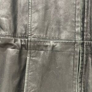 Black leather jacket with cinched waist. This jacket is missing the fur collar, but not needed for the coat. Please also note some wear in last picture at waist and by zipper.