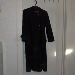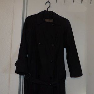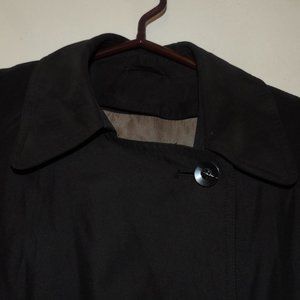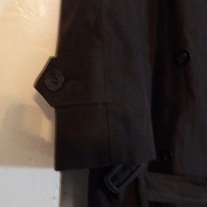black , double breasted, belted , removable lining is removed with zipper see images , side pockets, water repellant , buckled cuffs on long sleeves , has buttons on collar for a hood but this sale does Not include a hood , center back slit in good pre owned condition no issues there is something white on the buttons each button so maybe manufactured that way maybe not I dont know, cant find material contents but there is a tag that says machine washable or dry clean so dont know what that means , Size 8P measurements are roughly 48" from shoulder to hem and about 21" pit to pit , no holes or stains and minimal wash wear very good coat , pet friendly non smoking home