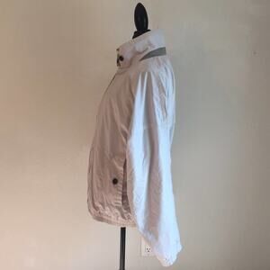 Destabilize: cinched at hem, zipper, plaid inner pattern button at neck line turtleneck