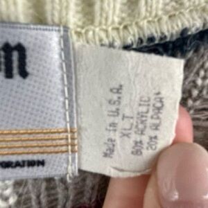 This London Fog men's vest is a vintage piece crafted in the United States. It features a multicolor geometric pattern and is made from an acrylic and alpaca blend, offering a soft and warm feel. Designed for the fall season, this sleeveless sweater vest has a V-neckline and is suitable for casual occasions. It is machine washable for easy care. The vest is in good condition but has some flaws. Keywords: London Fog, men's vest, vintage, multicolor, geometric pattern, acrylic, alpaca blend, sleeveless, V-neck, casual, fall, machine washable, XLT, United States.