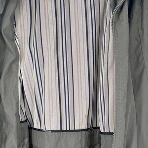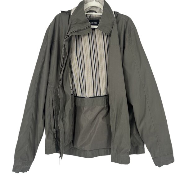 London Fog jacket, olive windbreaker, lightweight jacket, travel jacket, polyester nylon outerwear, green windbreaker, utility jacket, hidden pockets jacket, casual jacket