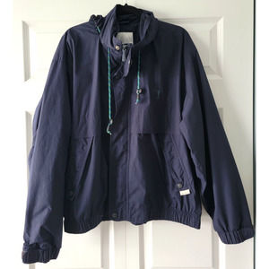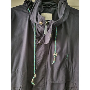 Men's windbreaker jacket in a dark navy blue color. Features a zip closure and buttons as well. Hood can be hidden in collar when not in use. Wrists can be adjusted (see 2nd picture). In good pre-owned condition! Has a small golf logo on the chest.