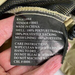 Material: Shell: 100% Polyurethane with 100% Polyester backing - Lining: 100% Polyester mesh