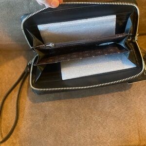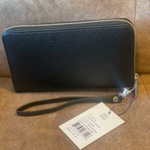 Brand new with tags! Stylish black wristlet wallet by London Fog. Features a sleek design with a convenient strap. Fits a large phone in front cell phone pouch.