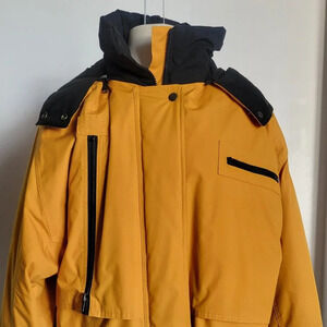 Classic London Fog Quilted Women’s “Thinsulate” padded bicolor puffer jacket featuring fabric, removable hood with zipper, high neck, front snaps, four zipped pockets, inner zip pocket, and removable warm lining. This is a heavy-duty coat that is sure to keep you warm in the winter. Designer color: Summit Gold and Black. See photo for exact measurements. Pre-loved coat is in pristine condition. Color: Bright Yellow & Black