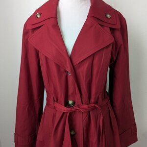 Stylish red trench coat by London Fog. Features a belted waist and button details. This jacket is so cute; it’s just too big for me. Probably best for 16-18.