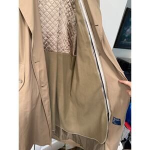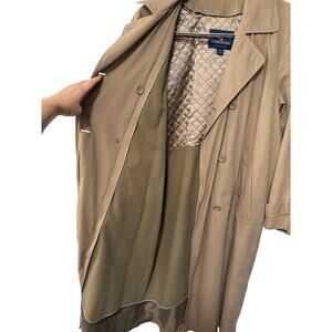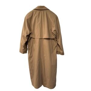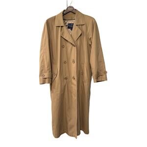 This London Fog trench coat in tan offers a timeless silhouette with a notched lapel and belted waist. Its full-length design ensures excellent coverage, making it a versatile addition to any wardrobe. Crafted from lightweight fabric, it exudes sophistication and elegance.