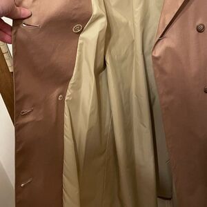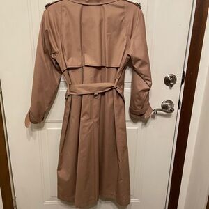 Tan London Fog trench coat in excellent condition. Size 6 petite. Thin shoulder pads. Side pockets. Belt around the waist.